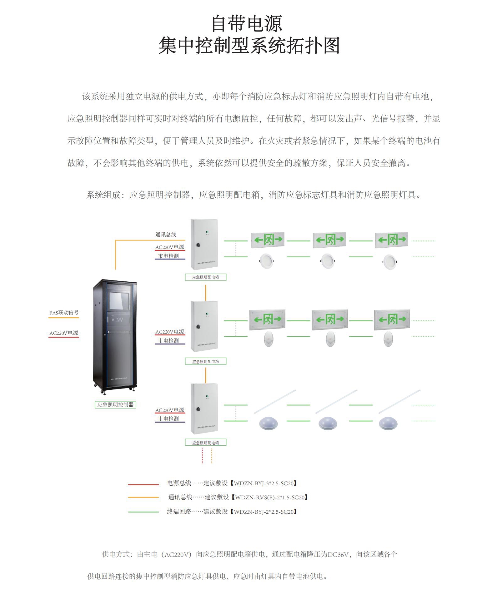 自帶電源集中控制型系統(tǒng):每個(gè)消防應(yīng)急標(biāo)志燈和消防應(yīng)急照明燈內(nèi)自帶電池,在應(yīng)急狀態(tài)下由燈具自帶電池供電
